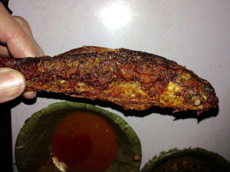 Marinated in a red curry and fried. Not overly spicy. They're grown in a pond nearby and fished out then sold by the pond owner. It's a little hard to eat at night because of the little bones but tasty.